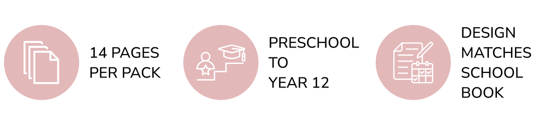 14 double-sided, think cardstock pages. Covering preschool to year 12.